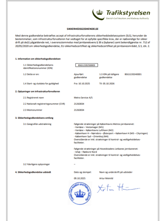 I Metro Service lever vi op til en række internationale standarder, og flere af dem er vi også certificeret i. Herunder ISO 9001, ISO 14001, ISO 27001 og ISO 55001, ligesom vi naturligvis er godkendt af Trafikstyrelsen.
